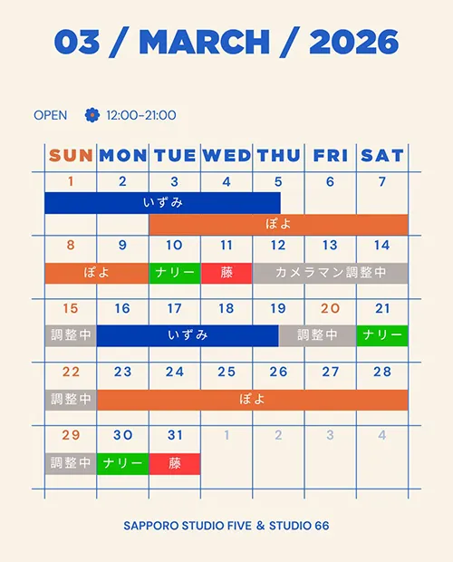 2月のカメラマンスケジュールとなります。(2/27更新)